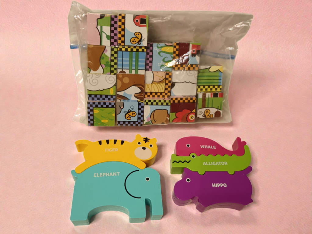 Állatos fa fejlesztő játékcsomag – kirakó és toronyépítő – használt, jó állapotban (B2)