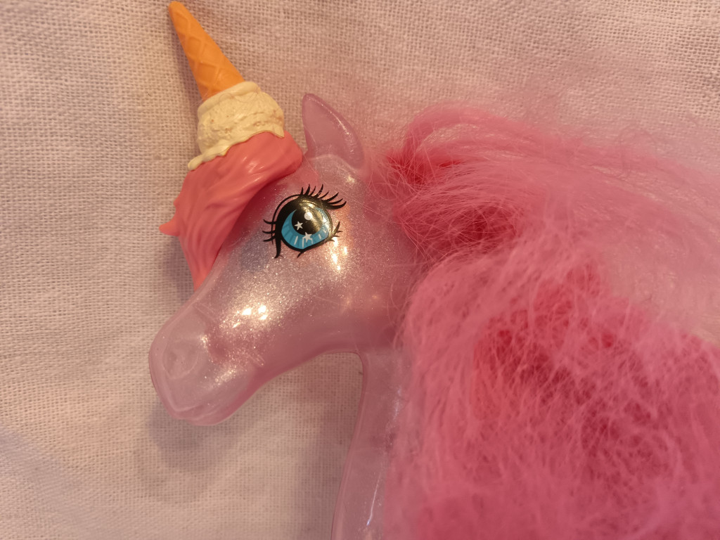 Ez a körülbelül 30 cm magas unikornis figura műanyagból készült, részletgazdag fej-, test- és lábkialakítással. Szőke (rózsaszínbe hajló) sörénye és farka hozzáadja a báját, a test áttetsző, enyhén csillámos hatása különösen elbűvölővé teszi. Állapota újszerű, nincs törés vagy repedés, a színek élénkek. Ruhát vagy más kiegészítőt nem tartalmaz — így a játékosok saját történetet teremthetnek köré. A műanyag felülete nedves kendővel könnyedén tisztítható.