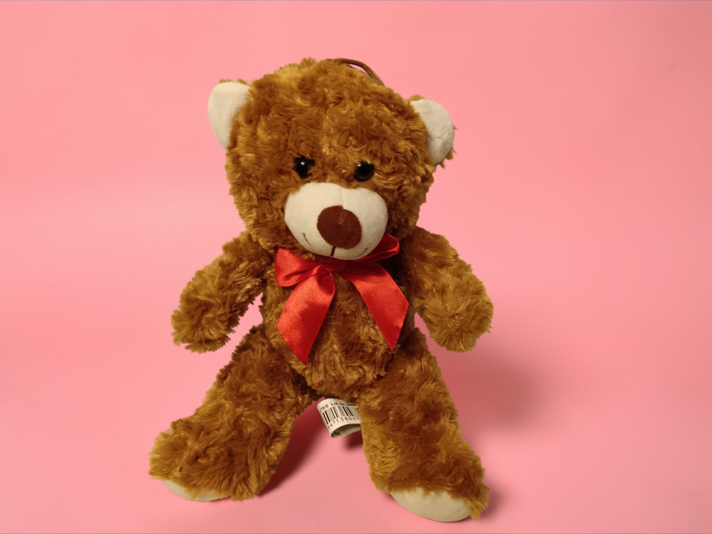 Ez a klasszikus, göndör bundájú plüss mackó igazi ölelni való kedvenc. Meleg barna színe, puha tapintása és a nyakában lévő élénkpiros masni ünnepivé és szerethetővé teszi. A kedves, nagy szemek és a békés mosoly olyan hangulatot sugároznak, amitől könnyen válhat egy esti mese csendes szereplőjévé vagy egy napközbeni vigasztaló társsá.