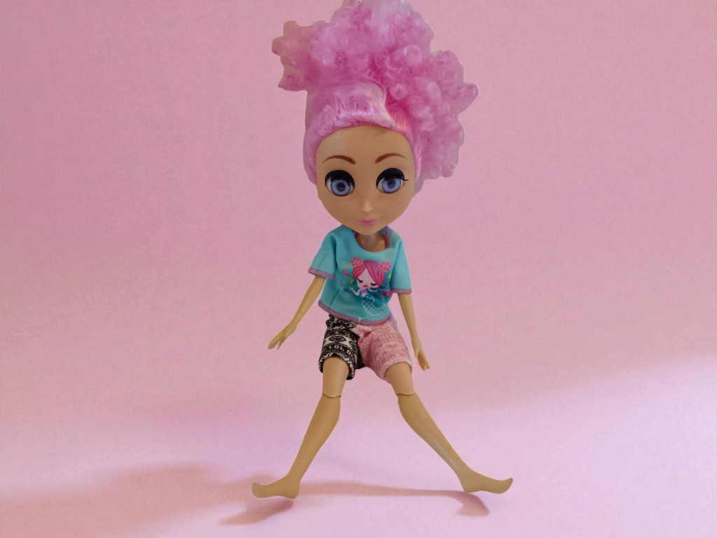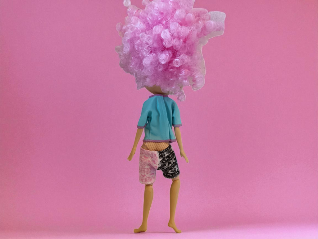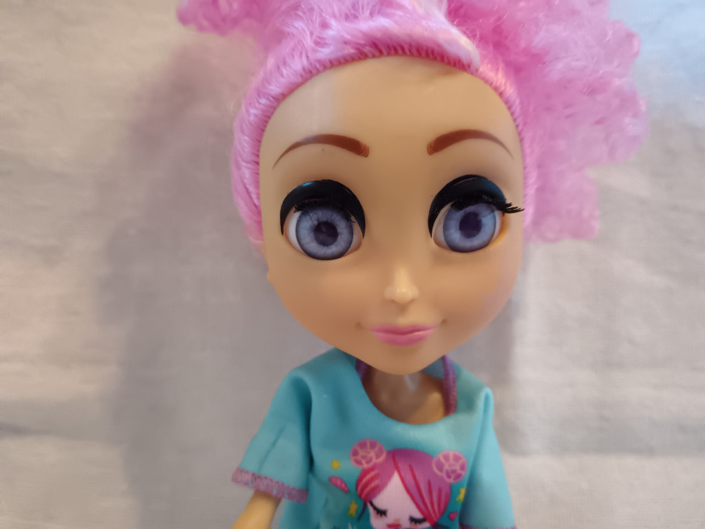 A baba egyedi megjelenését a rózsaszín, göndör frizura, valamint a kék póló és a kétféle mintás rövidnadrág teszi teljessé, ami kifejezi bohókás, kreatív stílusát. A ruha levehető, így a gyerekek különböző öltözékeket próbálhatnak ki rajta, fejlesztve finommotorikájukat és képzelőerejüket.