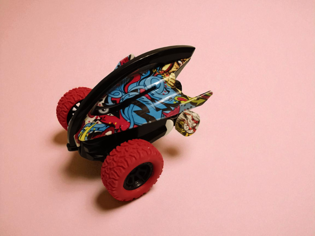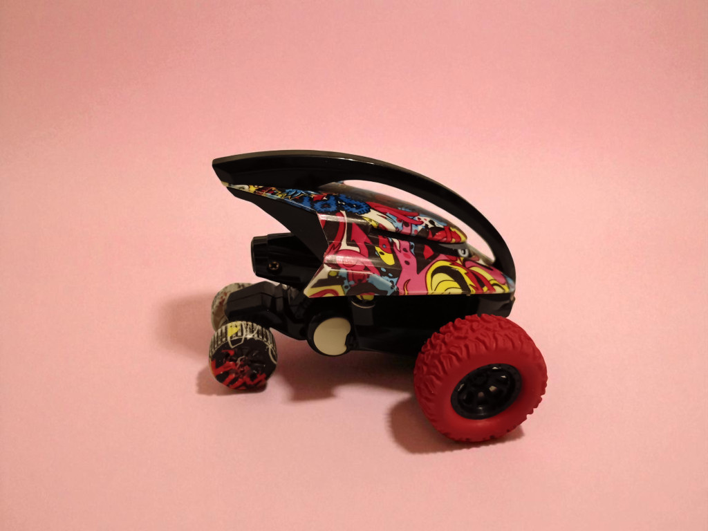 A 10 cm-es autó különleges, graffiti mintás kasztnival készült, ami szinte életre kel a fényben – minden nézőpontból más arcát mutatja. Nagyméretű, piros gumis kerekekkel rendelkezik, így a legnagyobb bukfenceket, ugratásokat és zuhanásokat is gond nélkül bírja. Képes 360°-os pörgésre és visszapattanásra, így igazi kaszkadőr bajnok, aki sosem marad a földön sokáig. A masszív műanyag test és a könnyű szerkezet kombinációja miatt benti és kinti játékhoz egyaránt tökéletes.