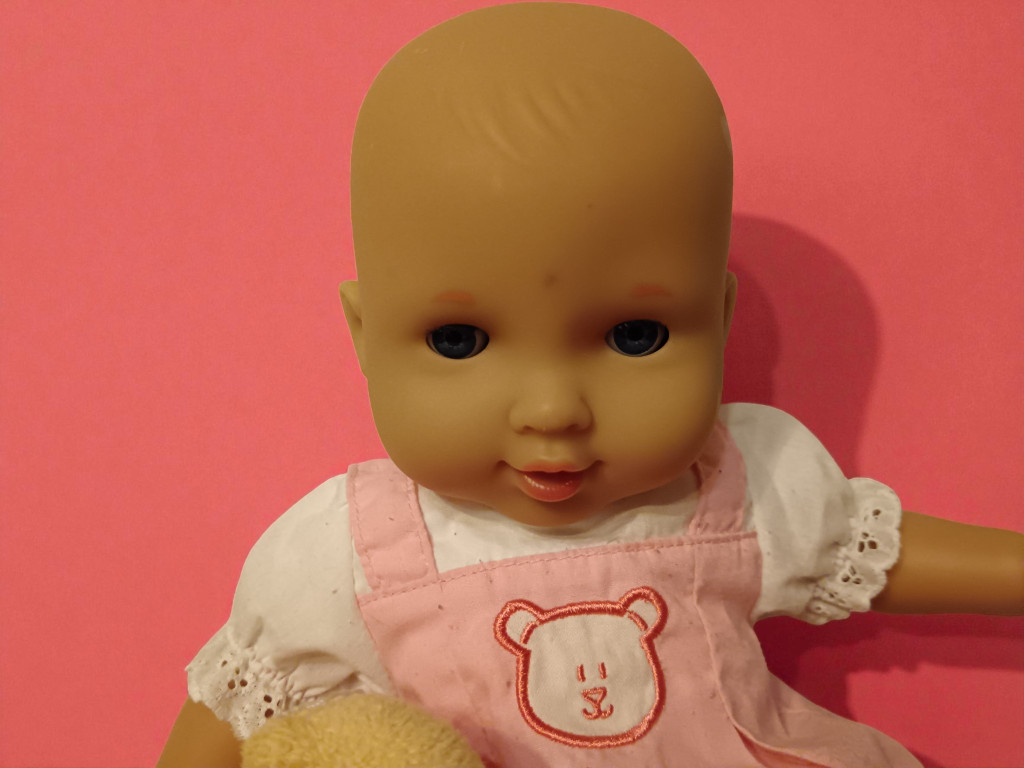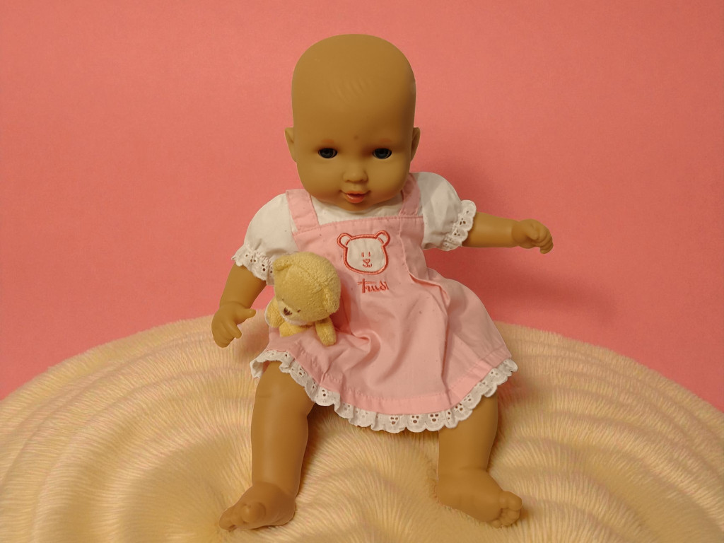 A képen látható baba a műhelyünkben a Bori nevet kapta. Bori csendesen érkezett meg hozzánk, ölében egy kis plüssmackóval, és olyan, mintha csak egy új mesére várna. Ez a 36 cm magas használt játékbaba kedves, valósághű arcvonásokkal készült, patái nincsenek – teste teljes egészében strapabíró, puhább tapintású műanyagból formázott. A hozzá tartozó rózsaszín ruha fodros ujjakkal és szoknyaszéllel díszített, ezért a gyermekek számára rögtön otthonos, szerethető megjelenést ad. Állapota jó állapotú: törés, repedés nem látható rajta, az arcfestés ép, a szemek jól záródnak, a karok stabilan mozgathatók. A felületen apró használati nyomok fedezhetők fel, ami a használt babáknál természetes, de nem zavarja a játékélményt. Bori ideális megoldást ad azoknak a szülőknek, akik tartós, biztonságos gondoskodós babát keresnek, mert segíti a szerepjátékot, az empátiát és a mindennapi „anya leszek” történetek újraalkotását anélkül, hogy túlpörgetné a gyereket. A baba mérete miatt könnyen beilleszthető a legtöbb 36 cm-es babaruhához, ezért a hiányos ruhatár sem jelent akadályt – Bori örömmel fogad új darabokat. A mi boltunkban a használt játékokat minden esetben kézzel válogatjuk és működésre teszteljük, így Borit is gondos tisztítás és fertőtlenítő áttörlés után készítettük elő. Otthoni tisztításához langyos, enyhén mosószeres kendő használata ajánlott, a ruhát pedig kímélő kézi vagy rövid gépi mosással érdemes frissíteni, majd alapos szárítással. Ha bármi gond adódna később, természetesen segítünk megoldani – nálunk minden játéknak új esély jár. Újonnan egy ilyen élethű játékbaba körülbelül 5.000–6.000 Ft körül kapható, de hiszünk abban, hogy a kedvencek újrakezdése is lehet ugyanolyan értékes.