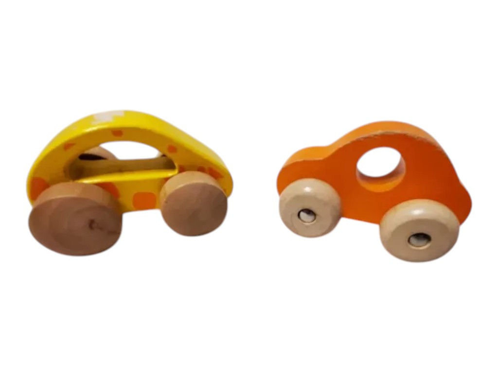 A csomagban két darab, kb. 9–10 cm-es fa autó található, természetes fából, lekerekített formákkal, könnyen megfogható kialakítással. A játékok használt állapotúak, látszanak rajtuk kopások, apróbb festékleverődések, de minden kerekük stabilan forog, és továbbra is masszív, időtálló darabok.