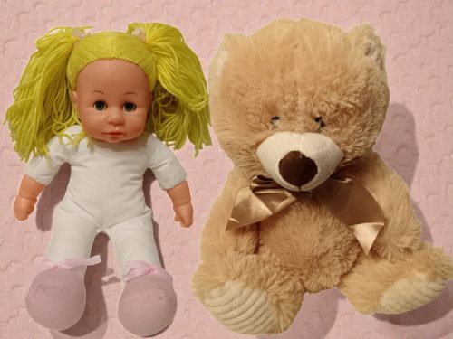 A játékokat kézzel válogattuk és működésre teszteltük. Tisztításuk egyszerű: a baba felülete enyhén nedves, puha kendővel áttörölhető, a plüss maci pedig kímélő kézi mosással vagy felületi tisztítással frissíthető, majd árnyékos helyen, természetes módon szárítható (szárítógép nem javasolt) – így hosszú távon megőrzi puhaságát és formáját.