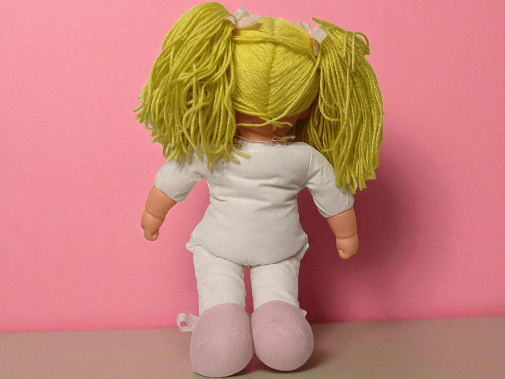 Ez a baba + plüss maci páros kifejezetten azoknak készült, akik nemcsak játékot, hanem érzelmi társat keresnek a gyermekük számára. A baba 38 cm magas, puha testű, könnyen ölelhető, világos bőrű, élénk kék szemű, szőke fonott copfokkal. A baba jó állapotú: a varrások épek, a test töltete egyenletes – így stabilan ül, könnyen tartható, és kellemes tapintású marad.