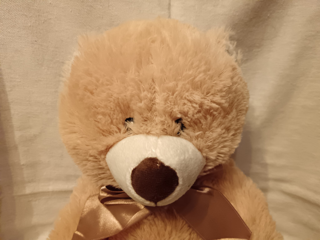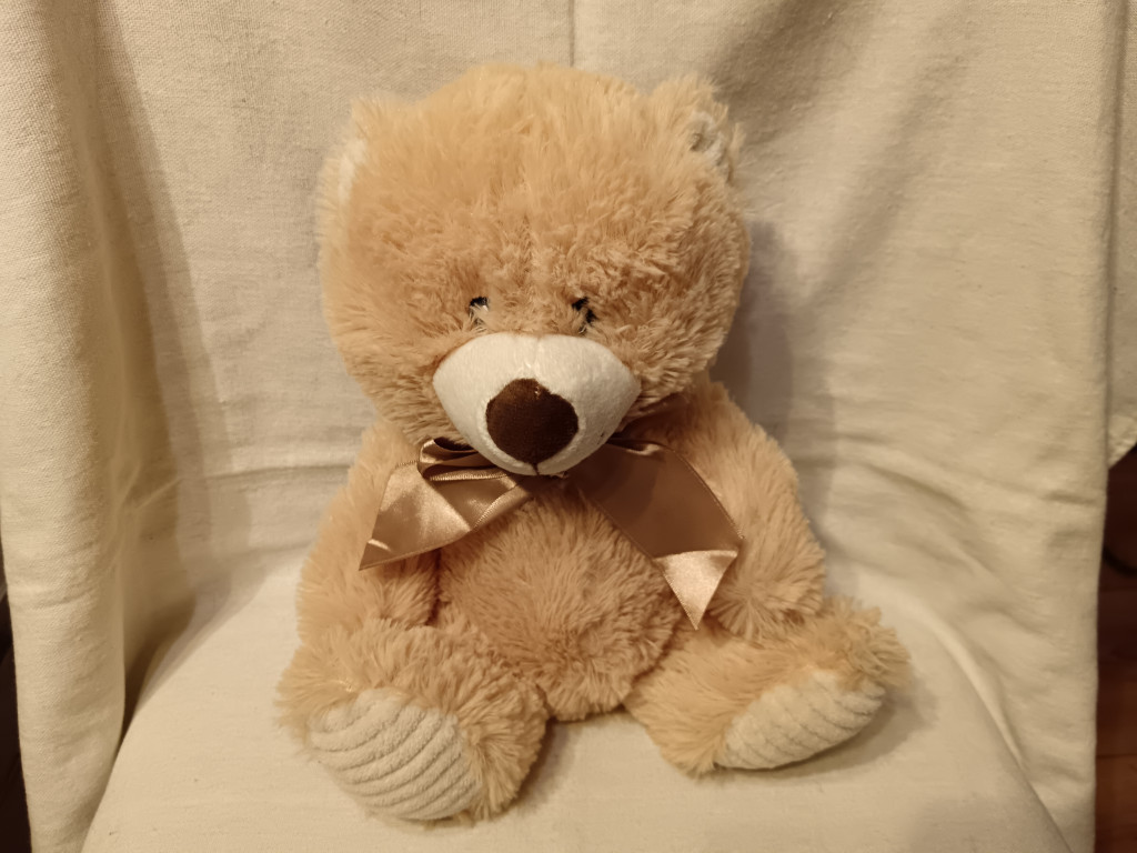 A hozzá tartozó 30 cm-es krémszínű plüss maci (Toyz4Lace) újszerű állapotban van: bundája puha, bolyhos, foltmentes, az orr és a masni ép, a varrások hibátlanok. Mérete tökéletes „alvótárs”, nem túl kicsi, de nem is túl nagy – pont akkora, hogy a baba ölében vagy egy kisgyermek karjában is kényelmesen elférjen.