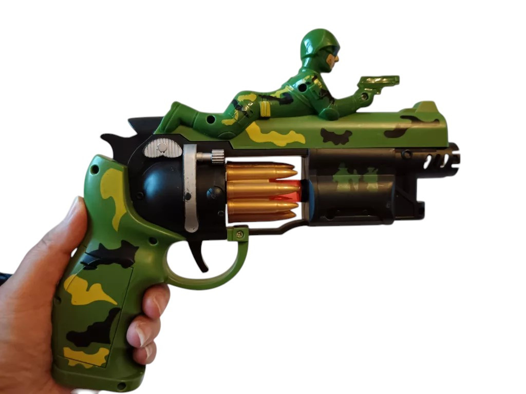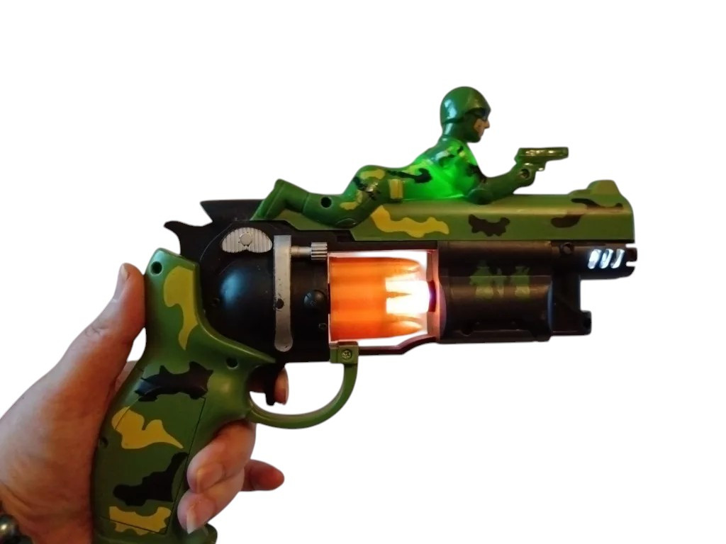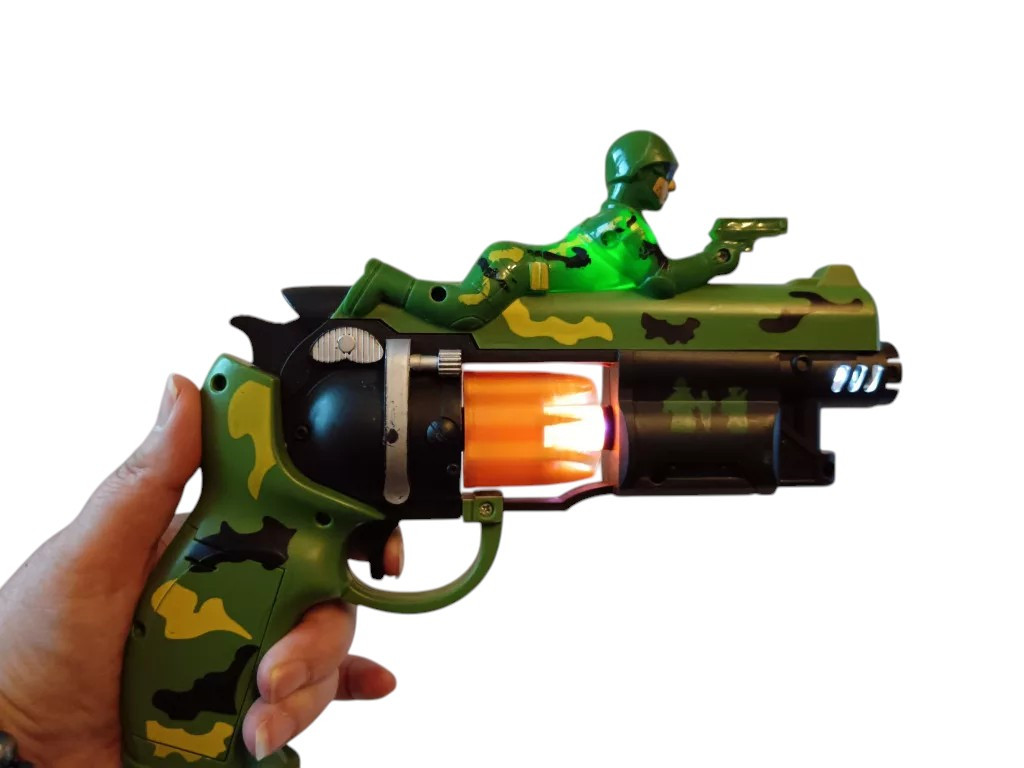 A 23 cm-es játékfegyver strapabíró műanyagból készült, és minden részletében a klasszikus katonai dizájnt idézi. A zöld-barna terepmintás festés és a mozgatható elemek valósághű hatást keltenek, miközben a villogó fény és a lövést imitáló hang még izgalmasabbá teszi a játékot. Használt, de újszerű állapotban van, minden funkciója hibátlanul működik. A hang- és fényhatások tesztelve, a pisztoly 2 db AA elemmel működik (nem tartozék).