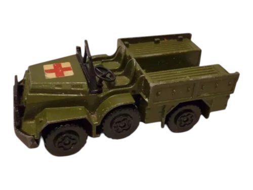 Ez a klasszikus Matchbox Battle Kings K112 modell a ’70-es évek katonai sorozatának egyik ikonikus darabja – egy igazi múltidéző játékszám, amely generációkon át kísérte a gyerekek fantáziáját a harctéri küldetések világába. A vöröskeresztes mentőautó fémháza még most is a minőségi Matchbox-gyártás lenyomatát hordozza.