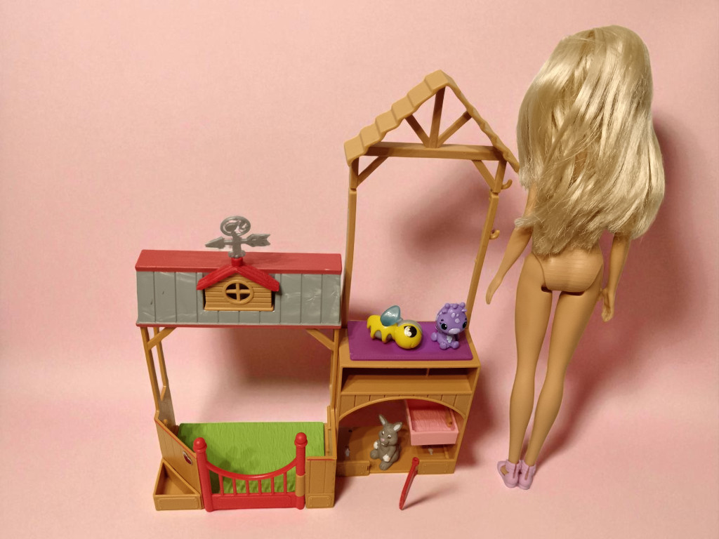 Mattel Barbie Sweet Orchard Farm állatorvosi farm játéktér, kb. 40×30×20 cm – használt, jó állapotban (kiegészítők nélkül) (C5)