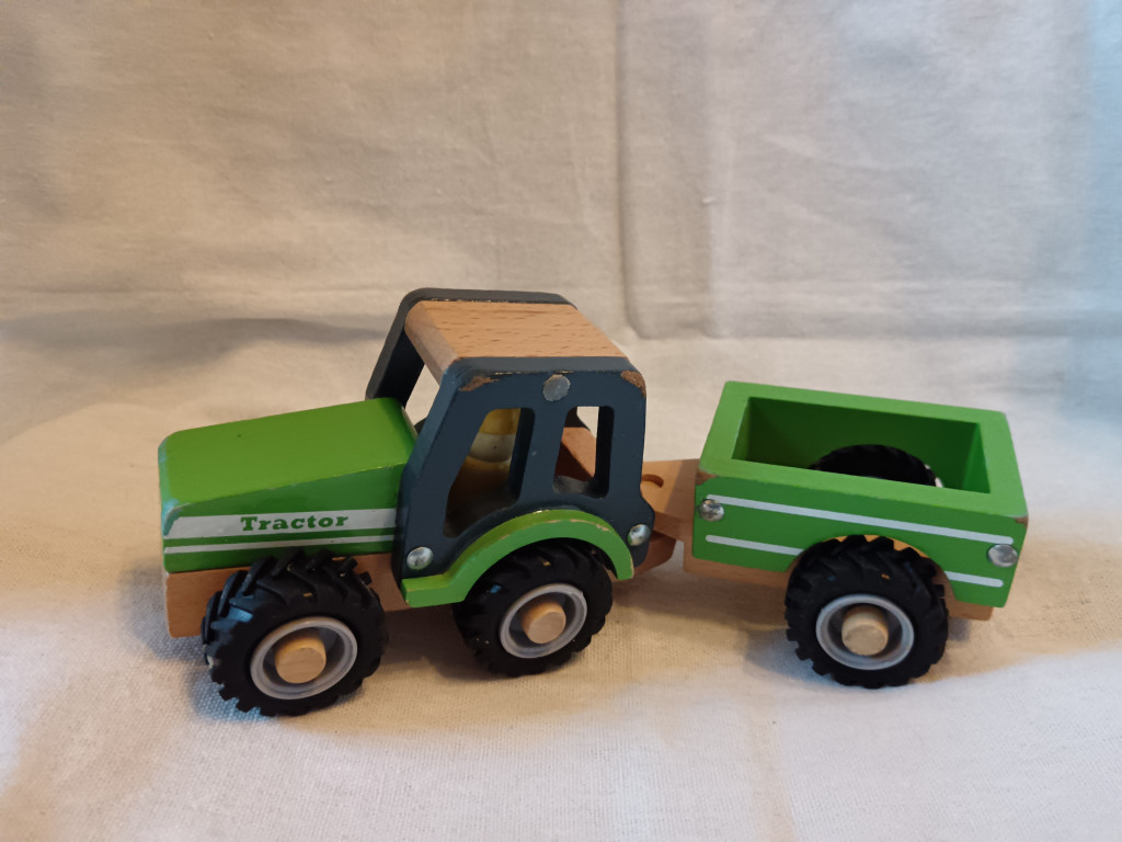 New Classic Toys fa traktor utánfutóval, 15×10 cm – használt, jó állapotban (G2)