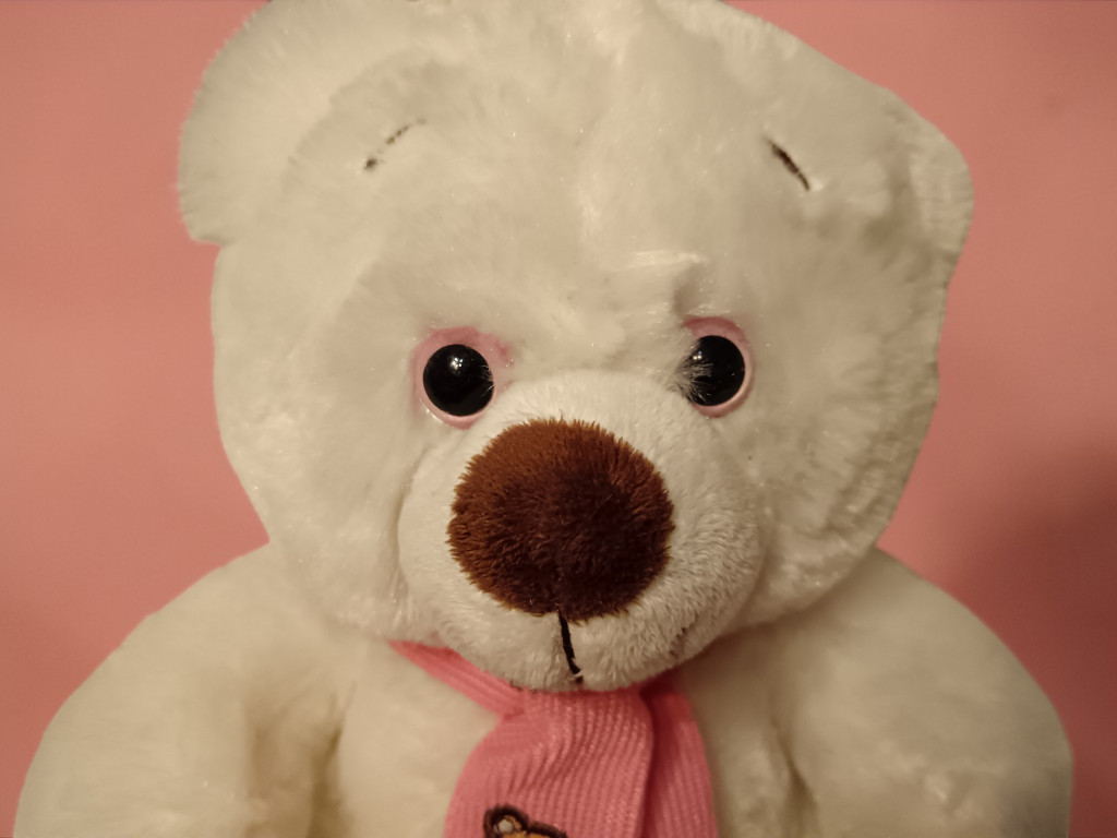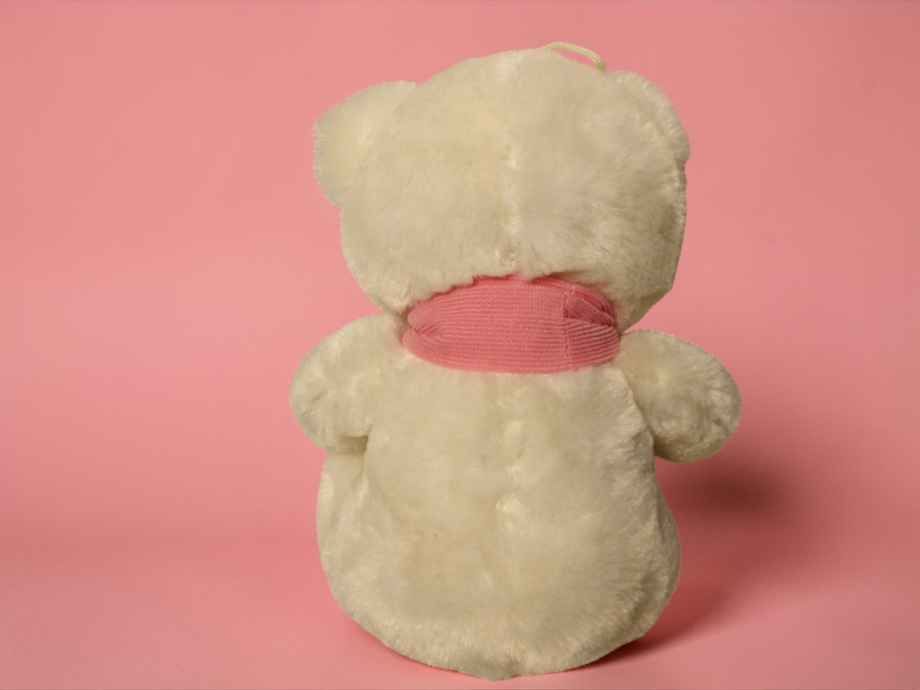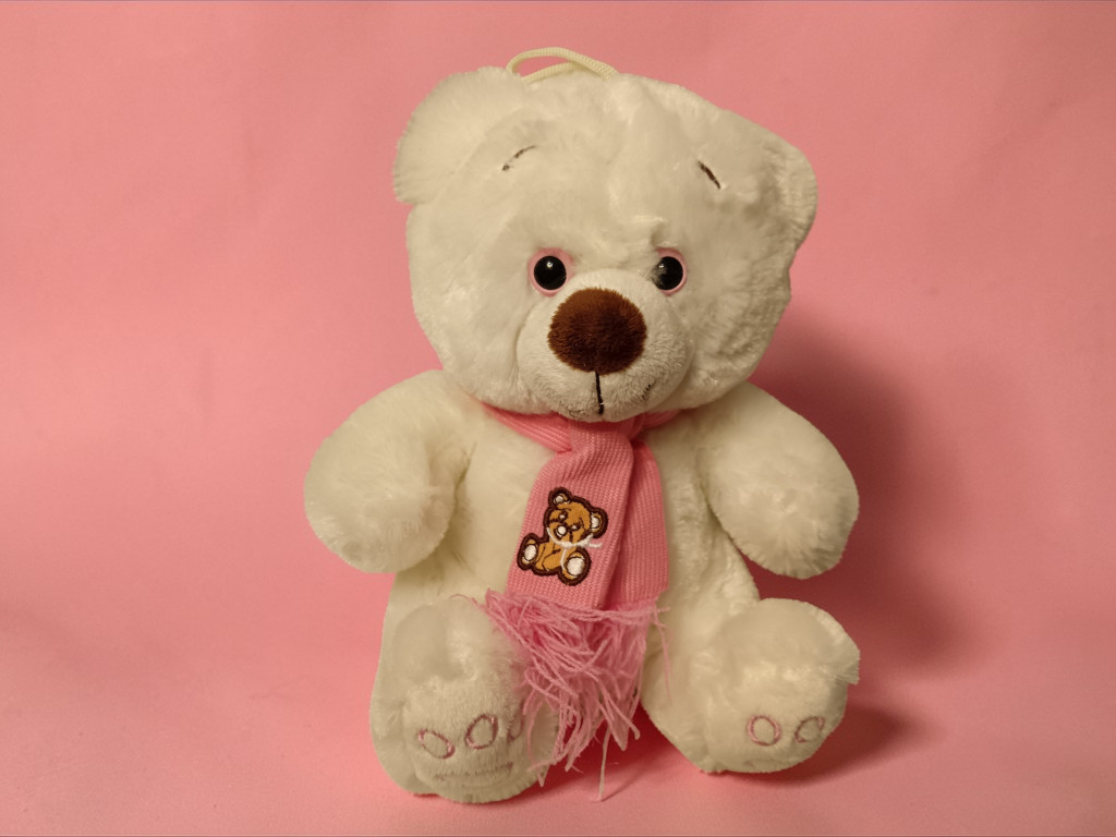 Ez a hófehér, puha plüss maci rózsaszín sállal igazi klasszikus ajándékfigura. A nyakában lévő sál apró hímzett maci mintával díszített, ami még bájosabbá teszi a megjelenését. Nagy, csillogó szemei és kedves arckifejezése miatt könnyen a gyerekek kedvencévé válhat – igazi ölelgetni való társ.