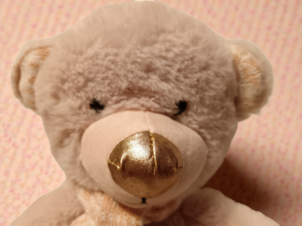 A maci 24 cm magas, kellemes tapintású, puha anyagból készült. Színe finom, pasztelles rózsaszín, apró részletei (orr, mancsok) harmonikusak, nem harsányak. Állapota újszerű, szakadás, folt vagy kopás nem látható rajta. Ez egy olyan plüss, amit nyugodt szívvel lehet átölelni – nappal és este is.
