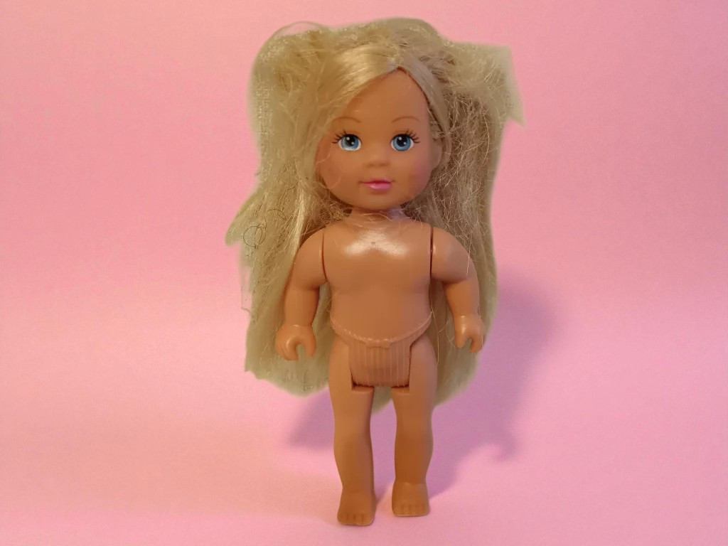 Lili egy 12 cm-es, Simba márkájú baba, kültéri és beltéri szerepjátékokhoz is tökéletes társ. Használt, jó állapotú, teste szép, ép, csak a haján látható kócosabb részek, amelyek könnyen kifésülhetők vagy újrafodrászolhatók – ez akár külön játékélmény is lehet. Könnyű, strapabíró műanyagból készült, így kisebb kezekkel is könnyen mozgatható. A kócos haj egyébként remek lehetőség a kreatív gyerekeknek: fonás, csatolás, frizurakészítés – Lili mindent türelemmel visel.