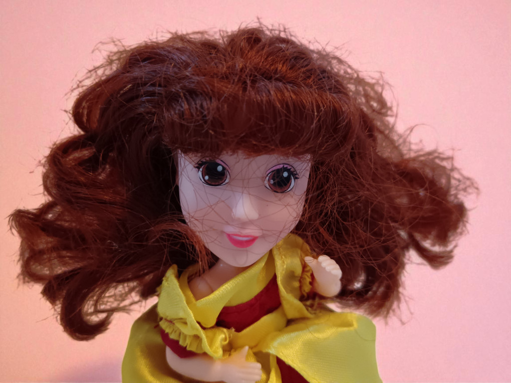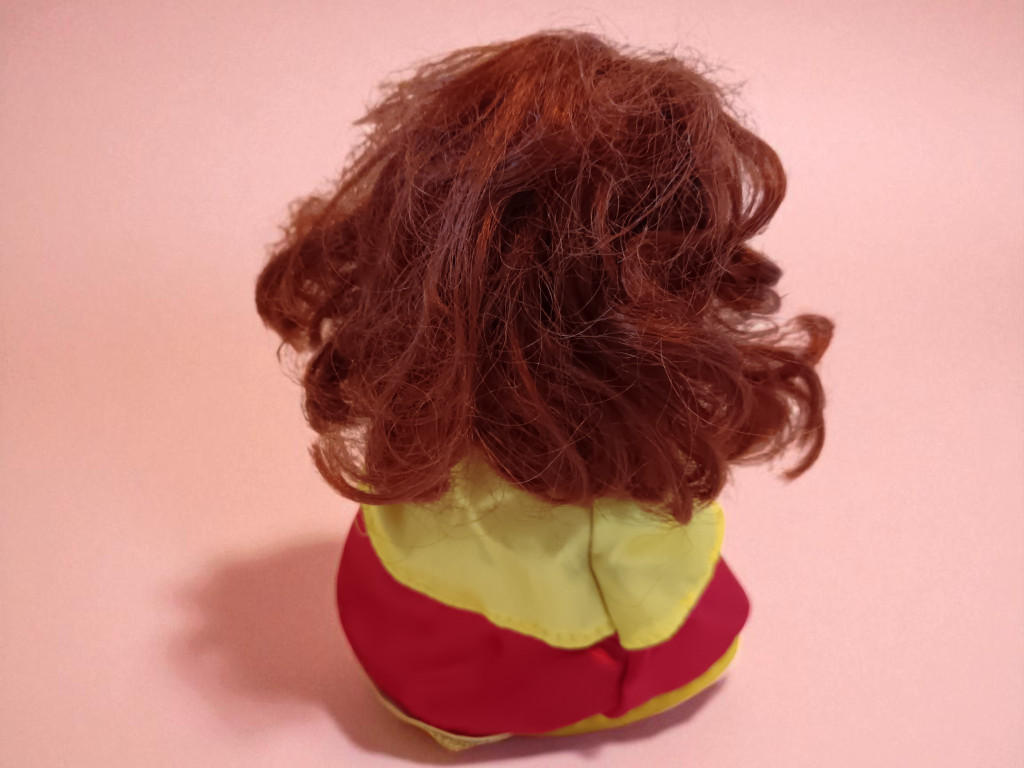 A baba használt, de jó állapotban van – haja kissé kócos, ami a korábbi játéknyomok természetes jele, viszont ez könnyen fésülhető és újra formázható. Arca szép, festése hibátlan, ruhája teljes és megkímélt. Kézzel válogatott és működésre tesztelt darab, így biztosan örömöt okoz majd új kis gazdájának.