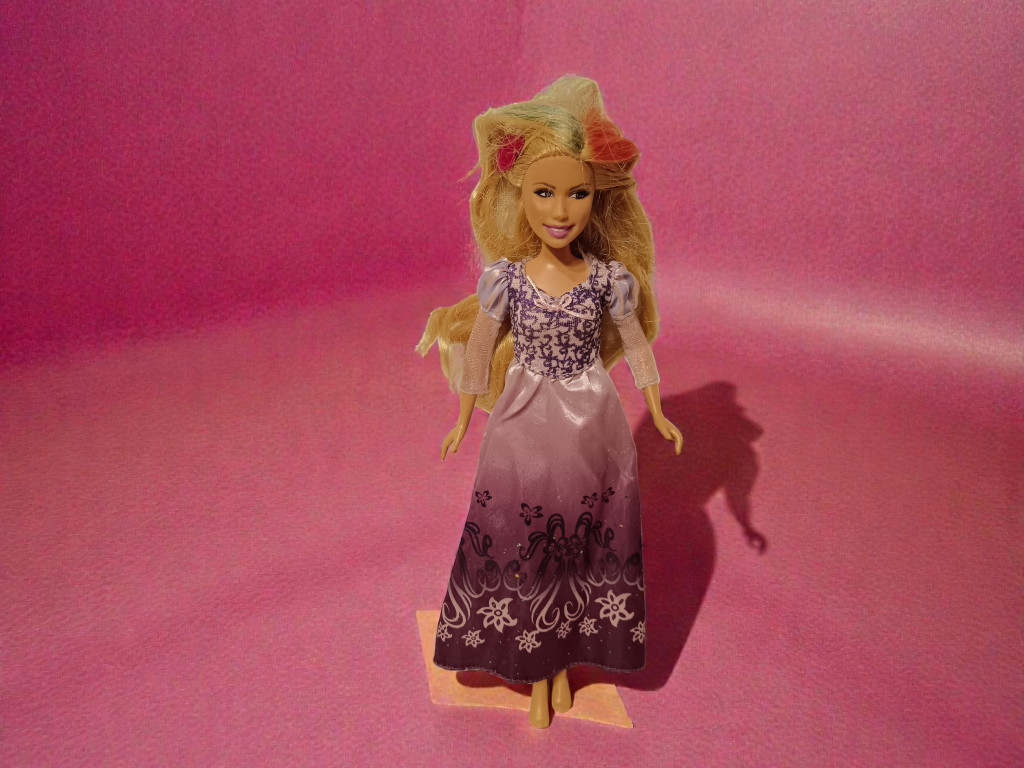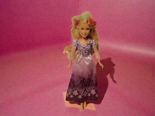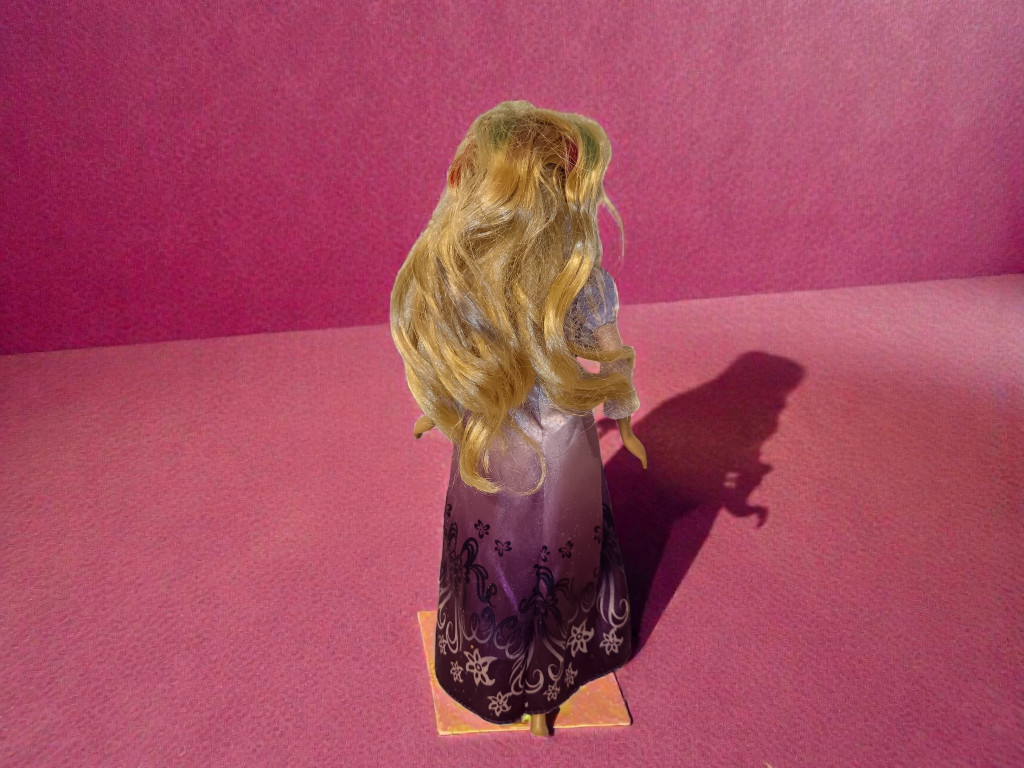 Van, amikor egy baba nem hercegnőként, hanem egy különleges történet főszereplőjeként érkezik. Ez a hosszú, hullámos szőke hajú divatbaba lila árnyalatú, finoman mintázott ruhájában igazi romantikus hangulatot áraszt – mintha egy esti bál vagy egy varázslatos kert ünnepi vendége lenne.