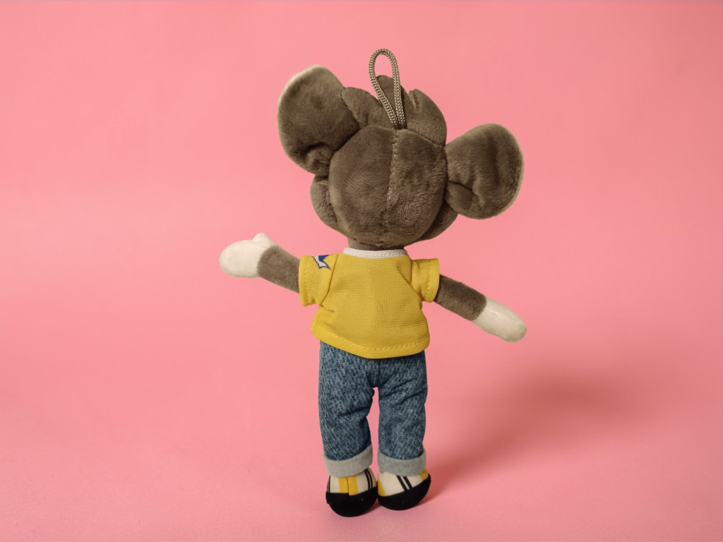 Ez a mosolygós, nagyfülű plüss egér figura igazi vidámságot sugároz. Sárga pólója, farmer hatású nadrágja és sportos cipője modern, játékos megjelenést ad neki. Karjai széttárva állnak, mintha éppen egy nagy ölelésre várna – az a fajta plüss, aki azonnal életet visz a gyerekszobába.